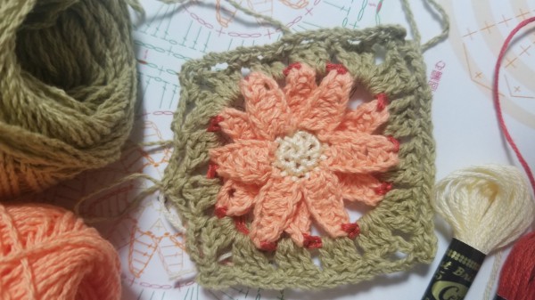 グラニースクエアのブランケット作成中。 happyknittingmamaさんの動画を参考にしています。