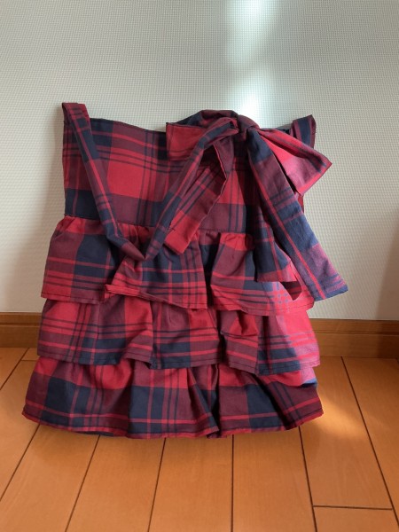 襟元とウエストにリボンテープです可愛く仕上げました。スカートにタックを入れすぎてボリューム出過ぎたのが反省点です。