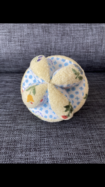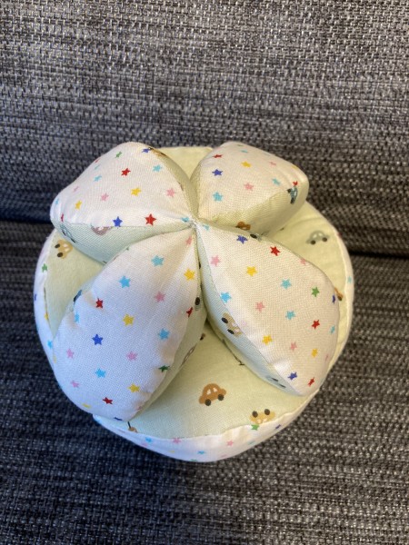 赤ちゃん用のおもちゃのボールです。 2種類の生地を組み合わせて作っているので、最後に三つのパーツを組み合わせるまで、仕上がりの状況がわかりません。 思ったイメージと違うとついつい,生地を変えて制作してしまいます。