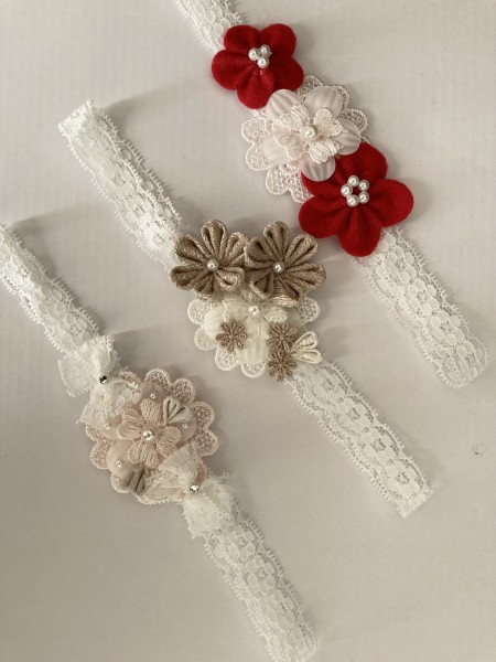 つまみ細工やレースなどを組み合わせて作ったベビーヘアバンドです。