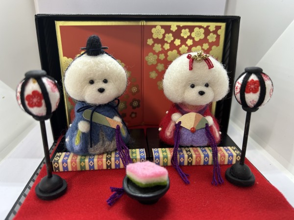 羊毛フェルトのお雛様 冠や烏帽子、ぼんぼりと菱餅も手作りしました ボディは針金入りで頭と繋がっています 箱に収納できる様になっています