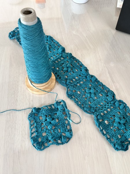 モチーフトートバッグの余り糸で、ワッフル編みのバックinバックを編みました。チョコミントを意識しました。