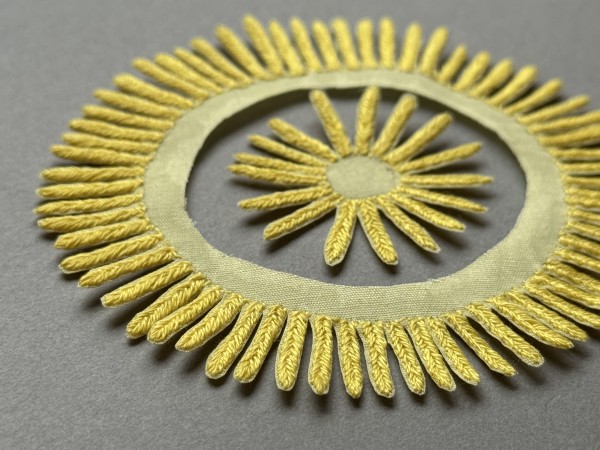 細い花びらの刺繍を布から切り取ったところ。 この後、花に組み立てていきます。