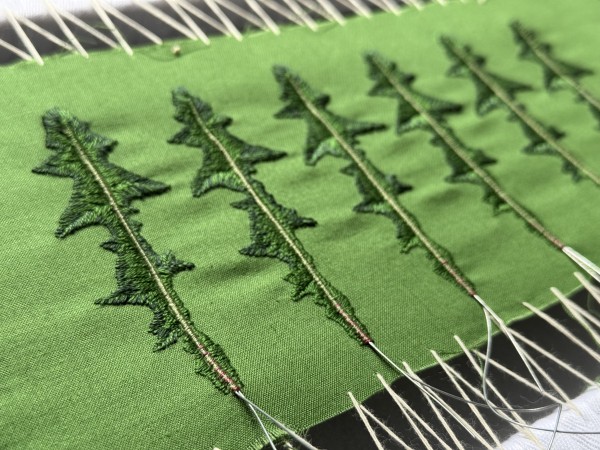 立体刺繍でたんぽぽを作っています。 写真は葉っぱの刺繍が終わったところ。