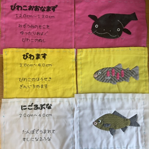 琵琶湖の魚の布絵本 前回赤ちゃんはいはいレースのゼッケンを作ったのがとても好評で、布絵本にして、教室の生徒さんに作ってもらうことにしました。