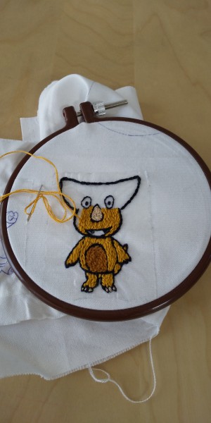 『かわいい刺しゅう』のキットでツバメちゃんの巾着袋です。友人へのプレゼントに、イニシャルをオリジナルで刺しました。