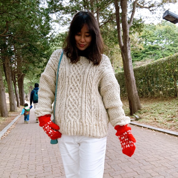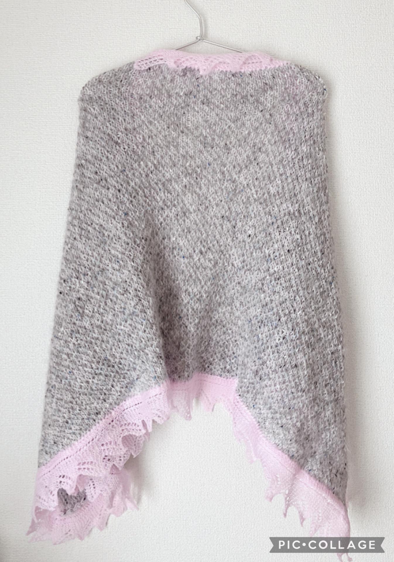 knit-c斜め編みの作品です。使用した糸がそれぞれゲージがちがうのでゲージを合わせるのが大変でした。