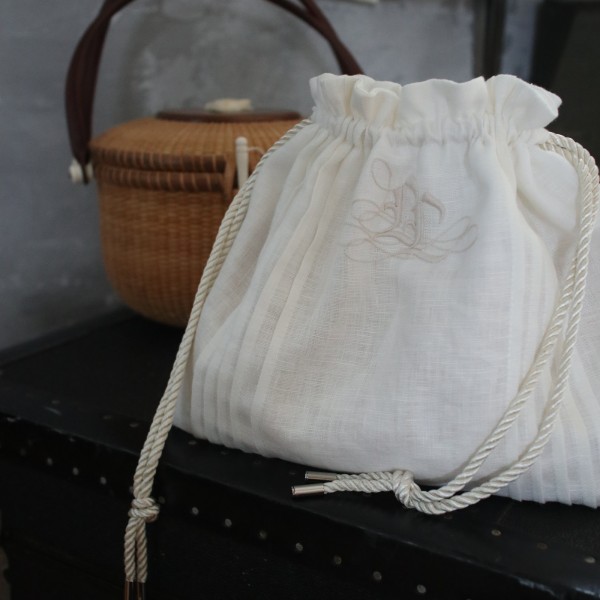 福田彩 刺繍ルームL&L monogram design ナンタケットバスケット、インナーバッグ 白いリネンにタック付きで巾着に仕立てました