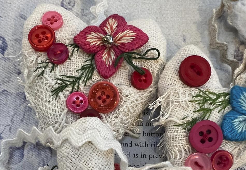 ハートのオーナメントに小さな立体刺繡の花とボタンをあしらいます。クリスマスにぴったりなオーナメントを一緒に作りませんか。