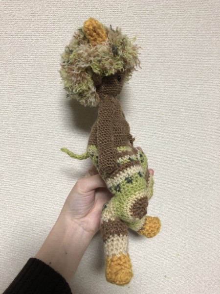| 連投しまくり失礼します…サテュロスのあみぐるみ3にん目。 腰から爪先までとじ針無しで曲げてみました。かなりいい感じで曲がった!嬉しい!! もう少し尻を丸くできないかなーとか尻尾に重量感出せないかなーとかまだまだ進化の余地はあります。今年もがんばるぞ! 体毛部分はユザワヤのフリーソック(フルーツ)。バナナ色。年末のセールでお安く手に入れたやつでめーっちゃかわいい!ただソックヤーンゆえ糸が細くて大変でした… |