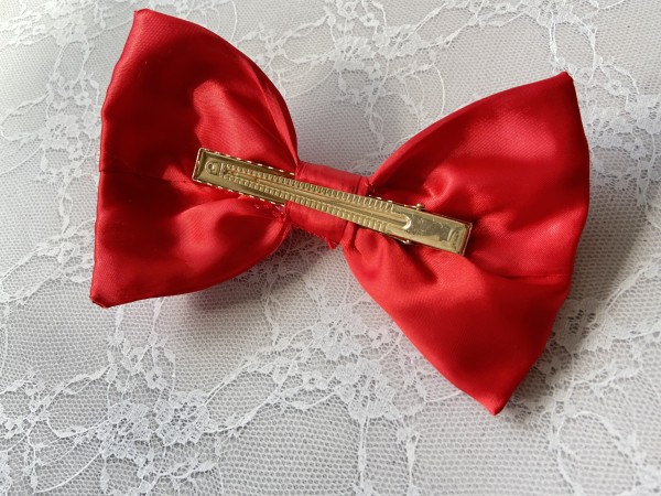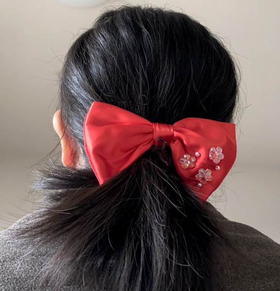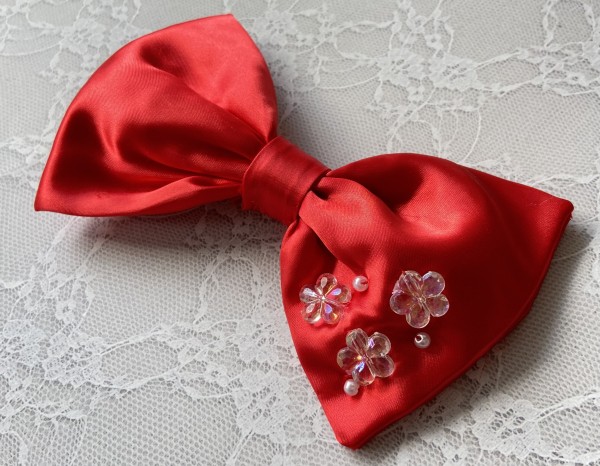 赤のサテン生地に花のビーズとパール調ビーズをあしらって、綺麗めでかつドレッシーなリボンを作りました!