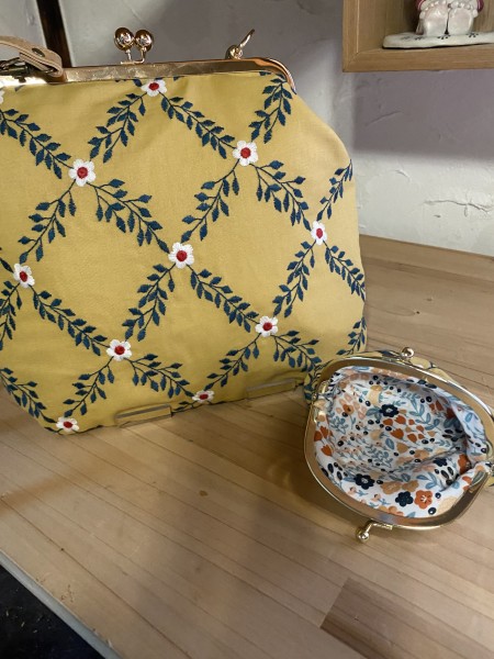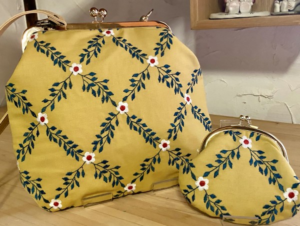 刺繍生地を使ったがま口ショルダーとこがま口のセットです。同じお揃いの布のこがま口を使うと心の中がほくほくとあったかくて優しい気持ちになります。小さなことだけど、自分を大切にすることにつながる気がするのです。