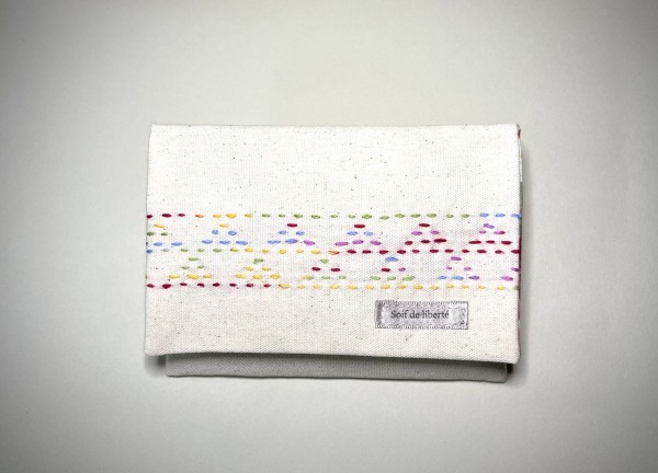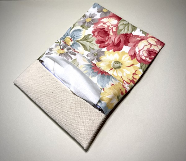| 外側は、シンプルに無地布に刺し子を施した「ふた付きポケットティッシュケース」。 内側は、ちょっと派手めのmods fabricsのプリント布。 ポケットティッシュは、そのままバッグやポーチの中に入れると無惨な姿になる事が多いけど、ふた付きのケースならそれが防げるので便利です。 |