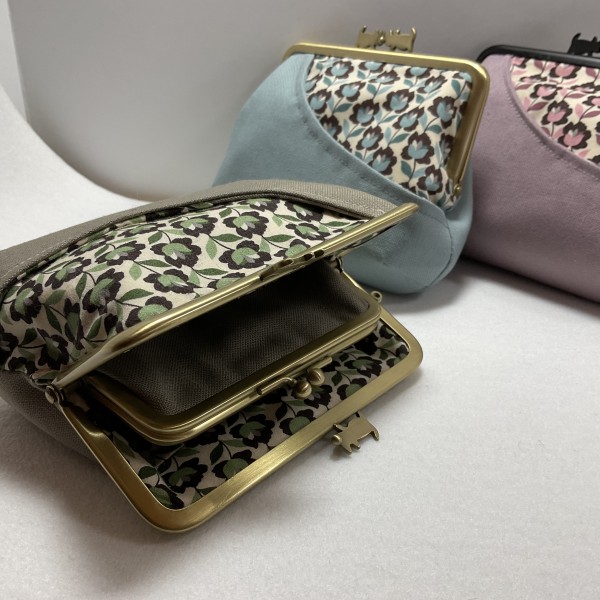 親子がま口ポーチです。硬めの芯を入れることでカッチリした出来上がりになりました。お財布に使うには硬すぎるのでそこが残念なところです
