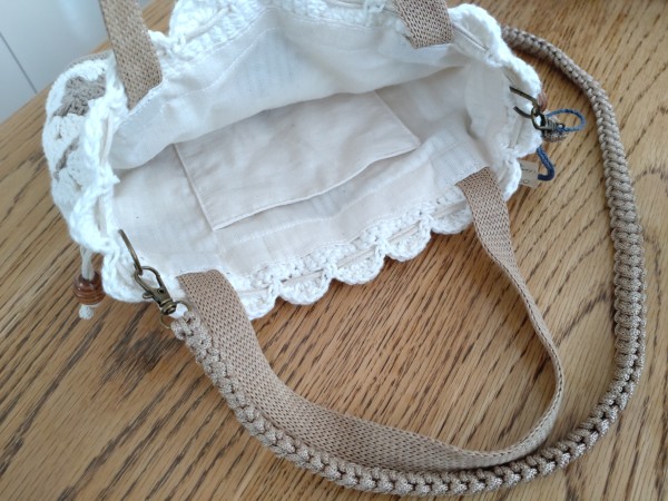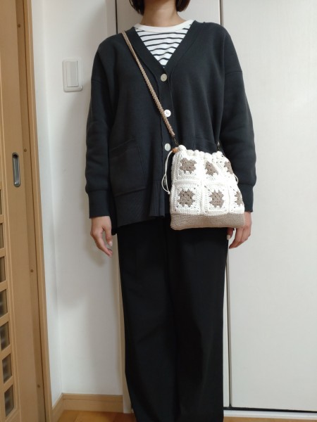 | コットンの糸で巾着バッグを編みました。 モチーフを12枚編んでつなげ、口部分は紐を通して巾着型にしています。 トートとして持てる短い持ち手と、取り外しのできるショルダー紐も編んで付けたので 斜め掛けバッグとしても使えます。 爽やかな感じでこれからの季節に重宝しそう(*^^*) 内布とポケットも一つつけています。 |