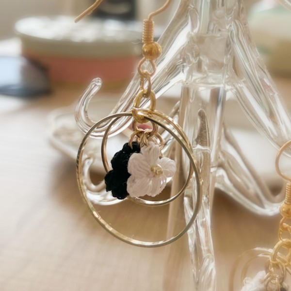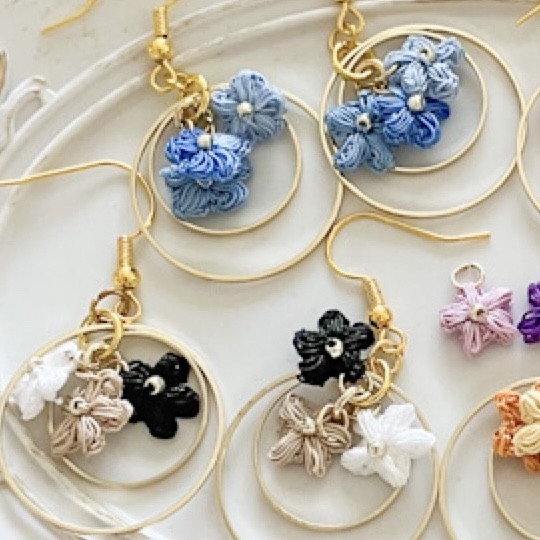 | DMCスペシャルダンテル(80)で編んだ小さな花のモチーフに丸カンを繋げて、ゆらゆら揺れるピアス完成しました! パステルカラー系は可愛く モノトーン系はシックに モノトーンは初めての組合せでしたが、今一番のお気に入りです! |