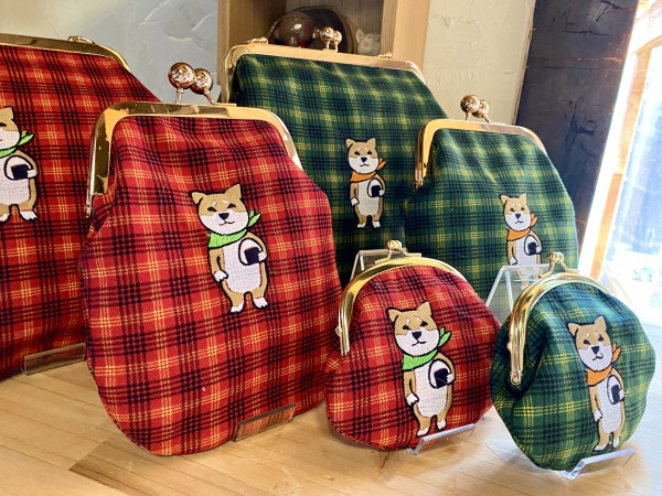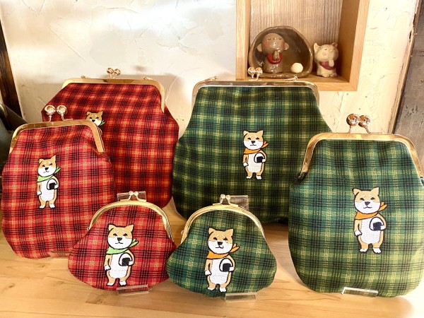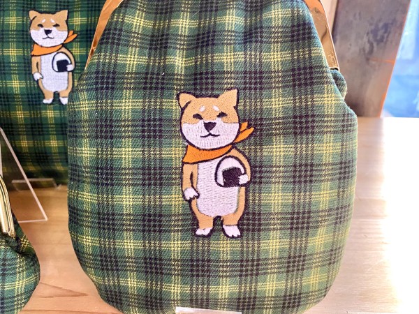 ちょっとレトロな布におにぎりを持った芝犬ちゃんを刺繍したがま口のセットです。