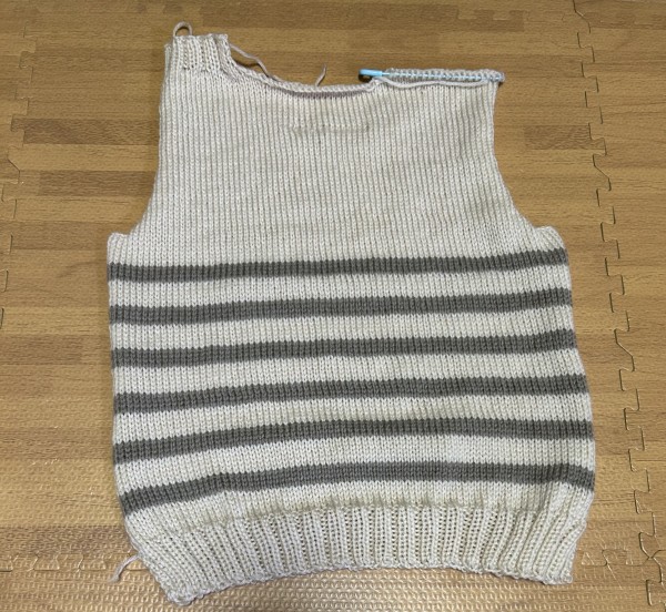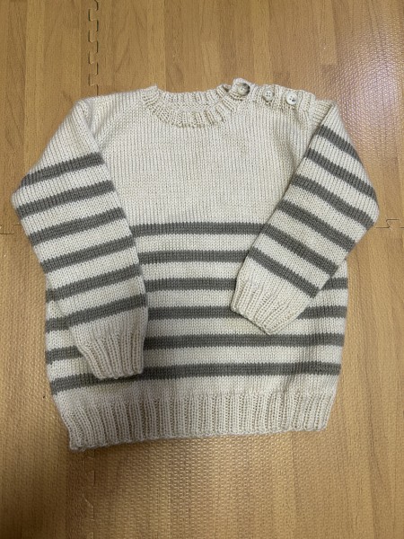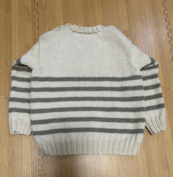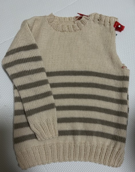 | 子供用セーターを編みました。 首周りがチクチクして着てくれないかも?インナー調整できてくれたら良いな。 |