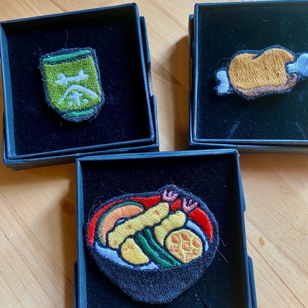 データを作ってミシン刺繍をし、ブローチに仕立てました。バックにつけると毎日着せ替え小物できます。