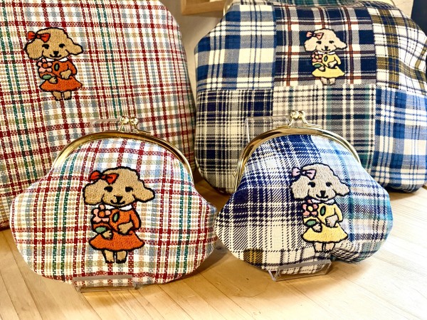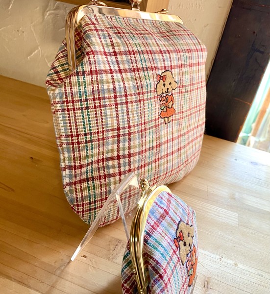 トイプードルの女の子を刺繍したショルダーがま口バックのお揃いを2パターンつくりました。この刺繍はオリジナルのデータを作れば同じものを色違いで作れます。ミシン刺繍の楽しさは格別です。また、この一年半、初めは納得できなかったがま口を毎日のようにつくり続けて、今では作ることで癒されています。