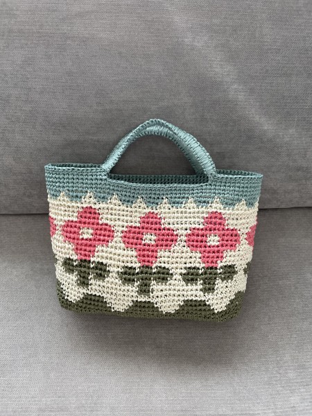 | 「おしゃれバッグと夏の帽子」から花模様のバッグを 持ち手はコブラステッチでアレンジしました。 アンダリヤは手が痛くなるし、肩もこるのでもうやらないと毎年おもうのだけれど 季節になるとやっぱり可愛いのであみたくなる。 |