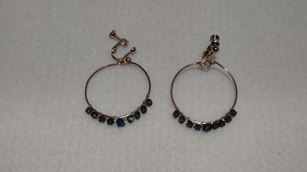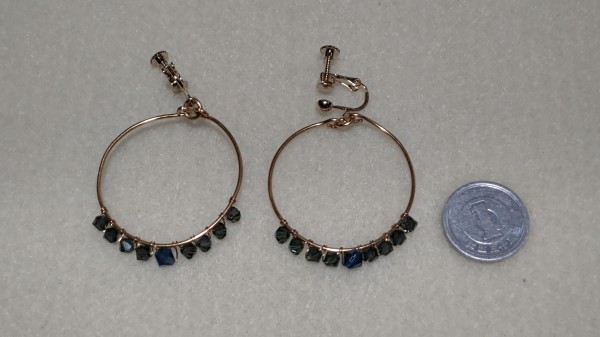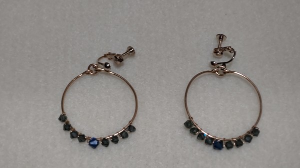 | ワイヤーをピケ(ほつれ止め)の容器に巻きつけて、 フープを作って、 同じ太さのワイヤーで丸カンを作ってイヤリングに通しています。 装飾は暗めのヴィンテージのクリスタルビーズを細いワイヤーで留めてます。 |