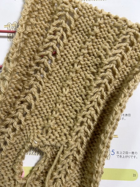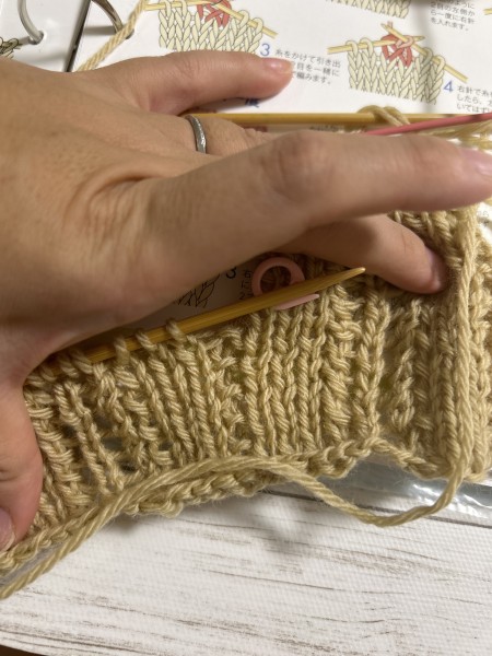 1目ゴム編みを透かし目に変更して作る。 あまりアレンジした事ないから無事に出来るといいな 2024/06/12 1玉編めた 裏の方が模様はっきりして可愛いかも? アイロンしたら表でもハッキリするかな…??