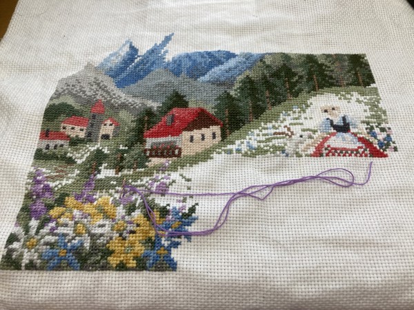 | この図案のハイジの髪の毛は金髪なのですが、 やはり、茶色のショートにしたいです。 背景と見極めて、金色三つ編みから、 茶色ショートにするつもりです。 |