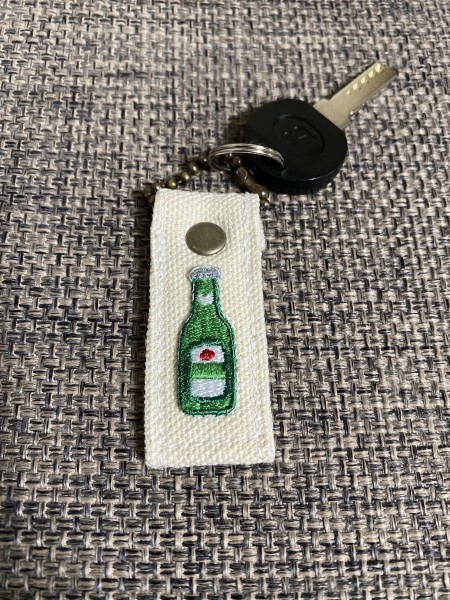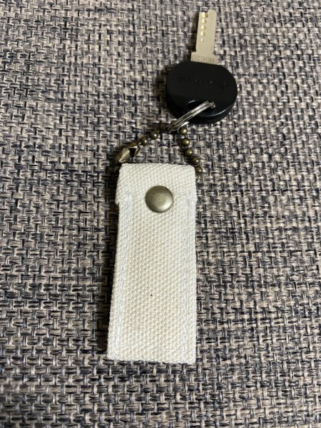 息子が台湾で買ってきてくれたワッペンを使って、自転車のキーホルダーを作りました。帆布カバンの、バネホックをつけているタグ部分を真似ました。