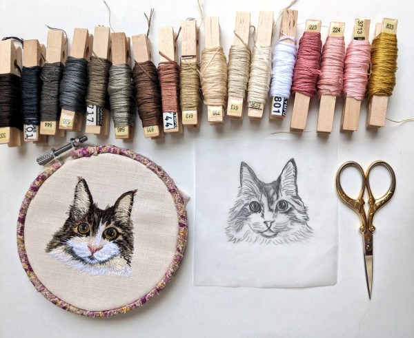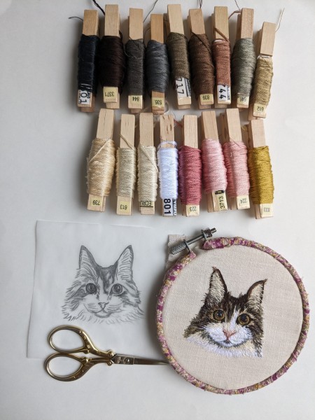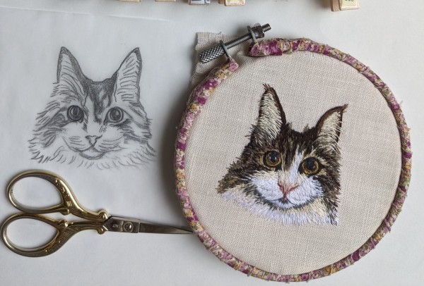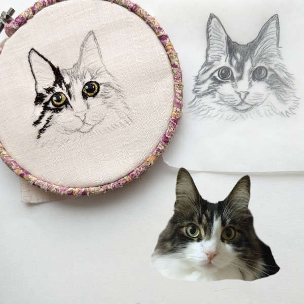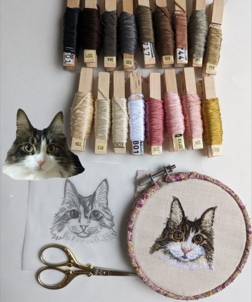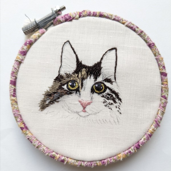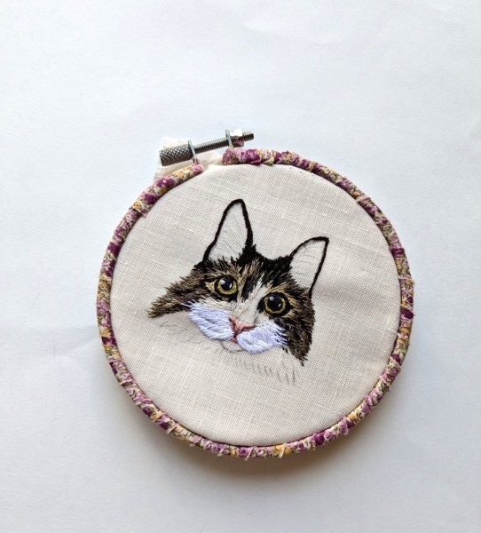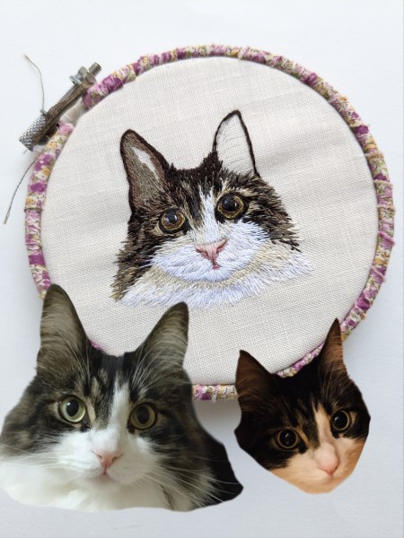 | 動物刺繍 ねこ 6月から思い立って動物刺繍オーダーを始めました。 写真より黒目をまん丸大きくとのオーダー 下絵イラストでは似ていても刺繍すると、本物に近付けるのが凄く難しいです… これから日々学んでいかねば… |