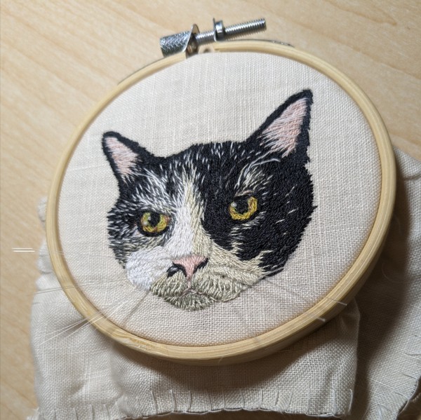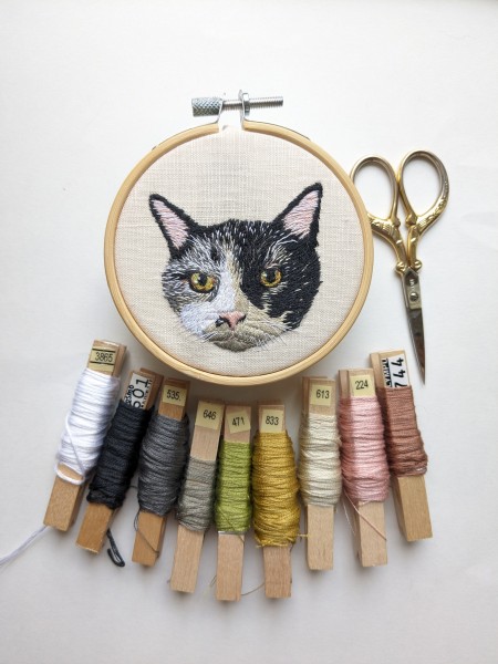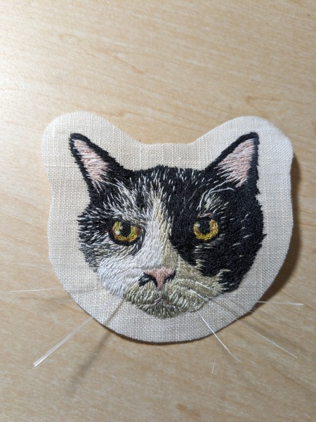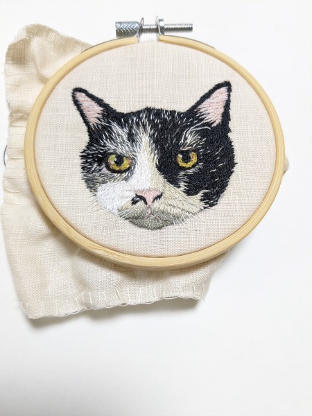 | オーダー刺繍ブローチです 写真を拡大しながら毛並みを足して、少しずつ似せていく動物刺繍がとても達成感があります 最初ヒゲは平面刺繍をしていましたが、ブローチにすると顔からはみ出る部分のヒゲを切る事になるので、ヒゲを触れる立体刺繍にしました。 猫の顔は絶対ヒゲがあった方が可愛い! 触れるヒゲのブローチになりました。 |