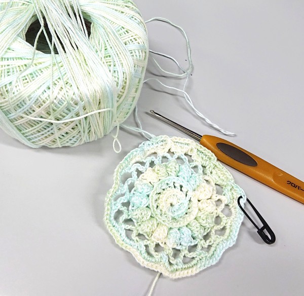 最終段開始。7月16日一枚目完成。すごく立体的で綺麗です。。ところが!こんどは糸が余った。25g玉×4玉余り‥‥つまり、材料半分残ってる。レシピの『材料90g/2玉』ってひょっとしたら90g×2ではなく、90g=45g×2玉準備だったんだ!と今頃気付きました。どうしよう