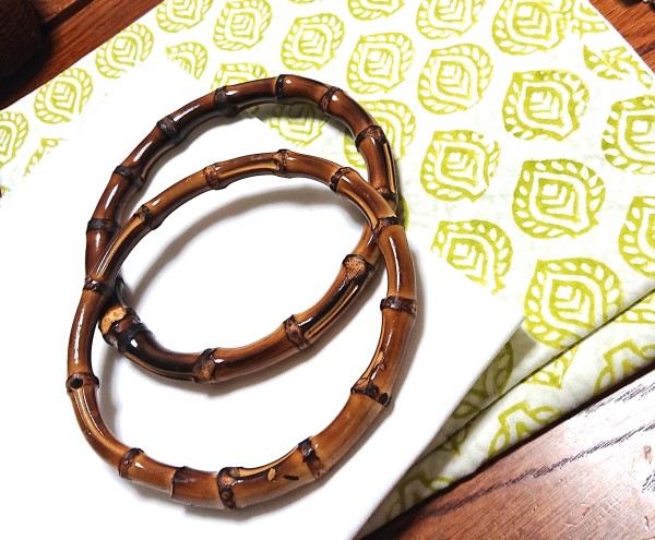持ち手も編んでしまおうかと思ったけど、レース編みは意外と重さがでてしまい、自重に耐えられず、型崩れをしてしまいます。散々悩み、がっちりしたバンブーのリングを付ける事にしました。マグネットボタンでしっかり閉じられるよう工夫しました。