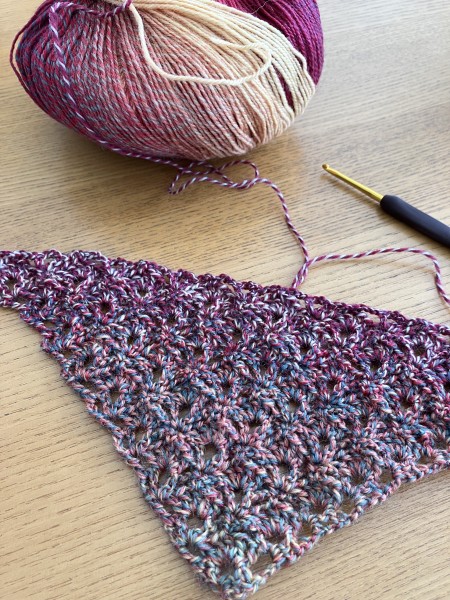 マルティナさんの三角ショールの編み方を参考に編み始めました。寒くなるまでに完成すればいいな