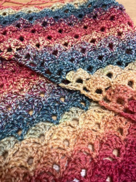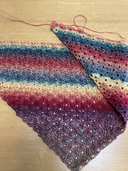 | ユウヤケで三角ショールを編み始めました 2玉編みきり、大きめショールが出来上がりました とてもかわいい編み地で、もう一枚作りたくなります |