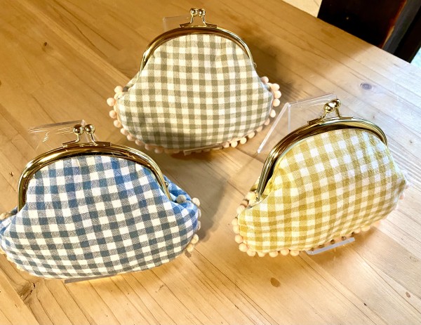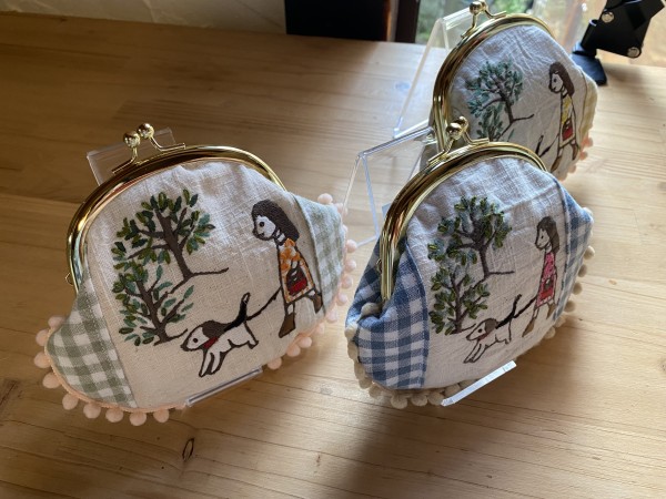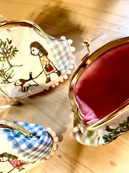 刺繍をして色違いのがま口を仕立てました。まわりにはポンポンブレードをつけて可愛くしています。