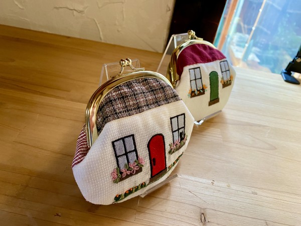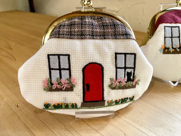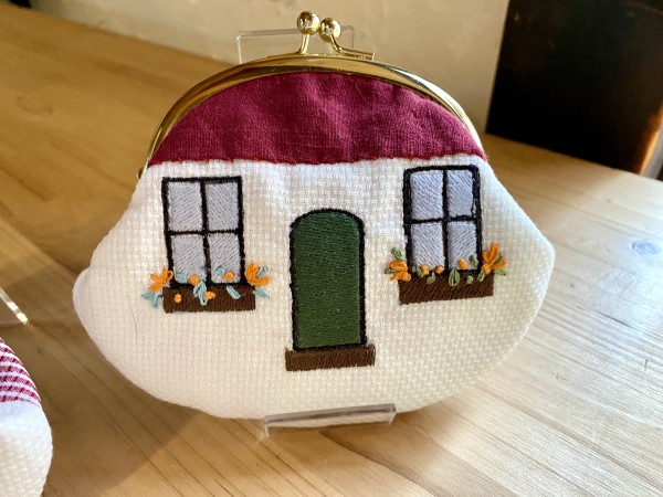 ハウスの刺繍をミシン刺繍と手刺繍で仕上げ、がま口にしました。