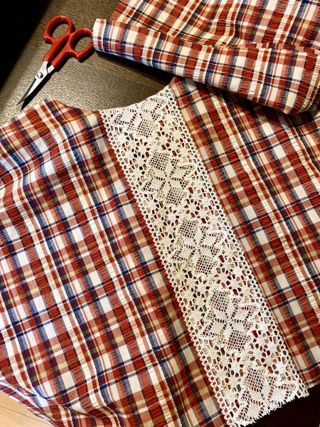 印つけ、裁断、ロックミシン、縫製、身頃までできました。