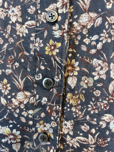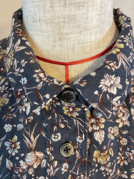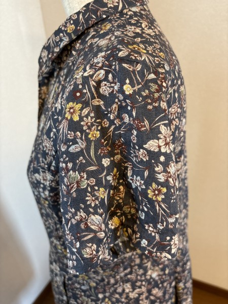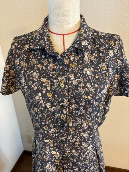 麻綿混布地で作ったワンピース。まだ暑い日が続いていますが、布地は秋模様の色と柄です。