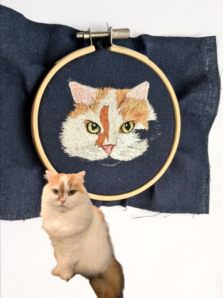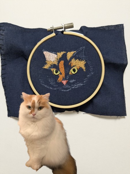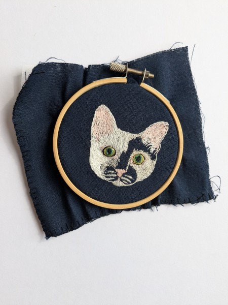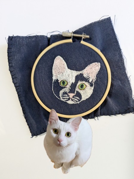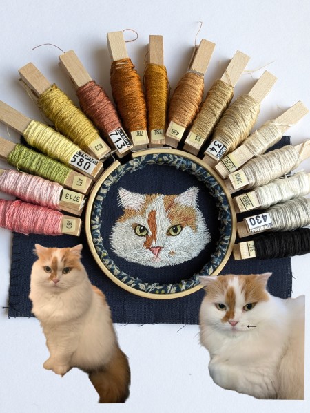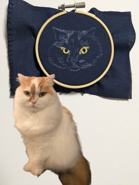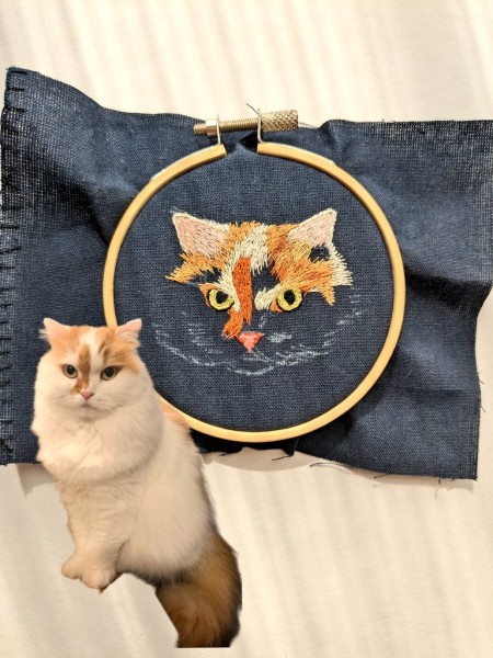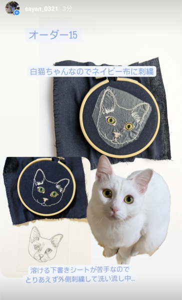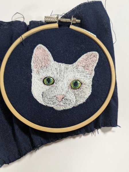 白系の猫ちゃんで2匹とも同じネイビー布に刺繍したので、縁どり色を何色にしようか悩み中…