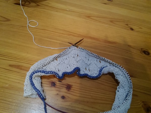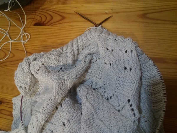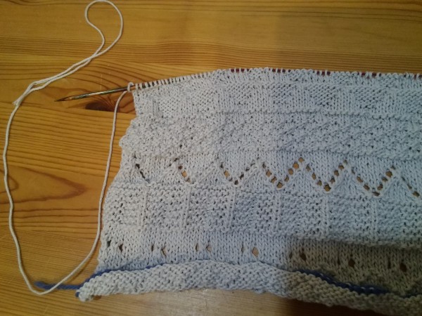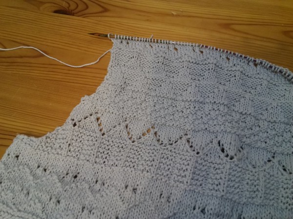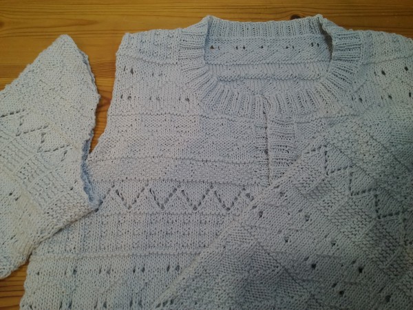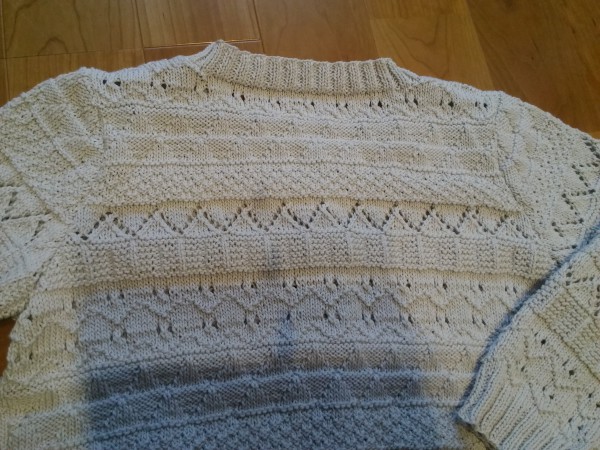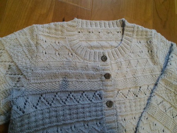 | 七分袖くらいのカーディガン。 身頃の前後で模様が違っていて、あまり飽きずに編めました。 前立ては元は一緒に編むデザインでしたが、ゴム編みに変えてあります。 (ヨーロッパの手あみ2016春夏の15) 糸はピエロさんのカルタ(コットン90%シルク10%)なのですが、これがとっても好みの質感で。一目編むごとに少し伸縮する感触があって気持ちよく編めてしまいました。この色しか買っていなかったので、機会があれば色違いで今度はこれより丈の長いセーターなど編みたいと思ってます。 |
