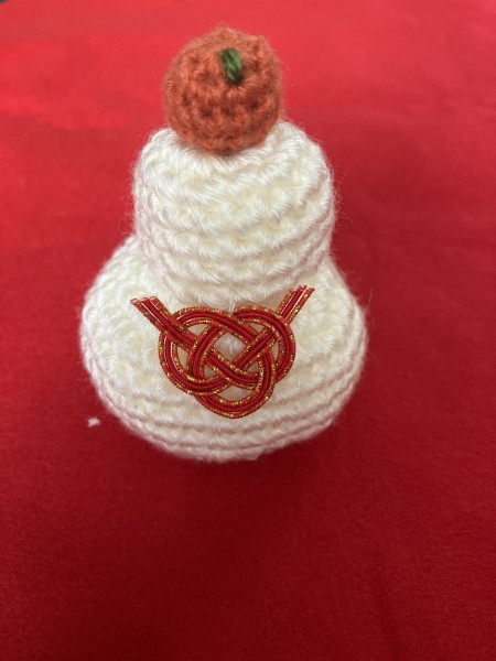 お餅部分は中細アクリル毛糸2本どりで6号針で編みました