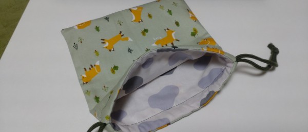 裏地付きの巾着2サイズです。ねこ柄から作ったところサイズが小さかったので、寸法を大きくして狐の生地でもう一つ作りました。