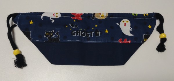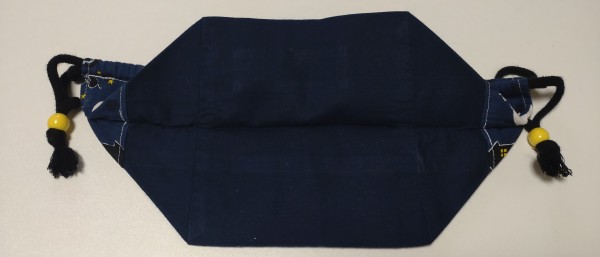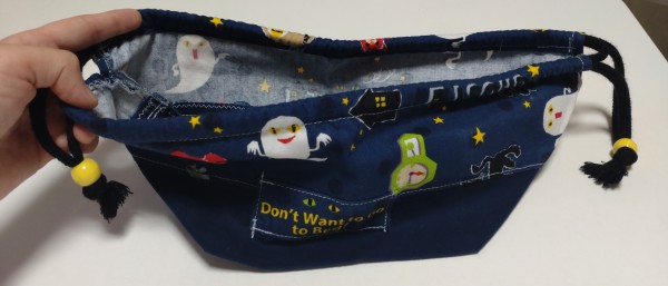 丼型のお弁当箱用の巾着です。洗い替え用に2つ作りました(1つはパックマン柄)。こちらはタグとして生地の柄を切り抜いて縫い付けてみました。あまりおしゃれにはなりませんでしたが個人的には気に入っています。