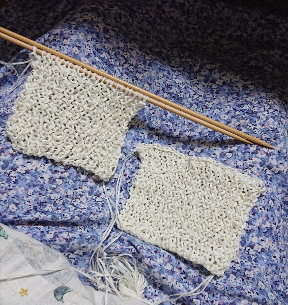 メッシュニット開始。まずはゲージを調べました。編み始めは8号針作り目です。編み方の説明をよく読まず、棒針1本で作り目したら、ゲージの目数がきつくなってしまいました(右)。作り目を2本の棒針で作ったら、針を変えていないのに目がゆるくなり指定ゲージに近づきました(左)