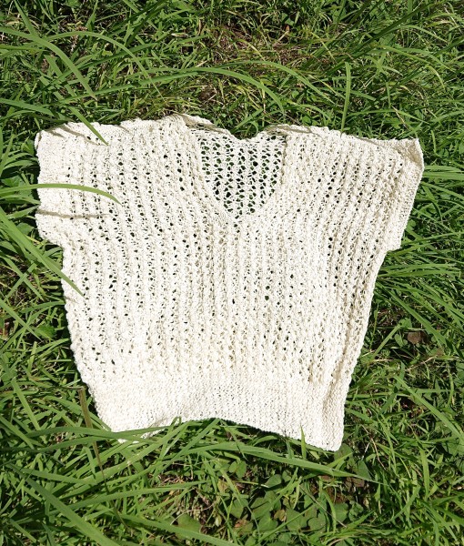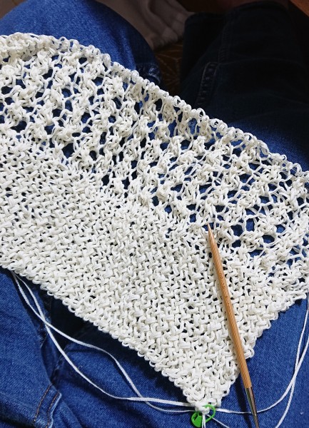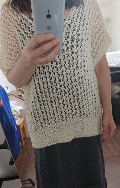 | itoito社の編み図 「メッシュニット」を製作しました。夏糸は編むのが大変ですが、出来上がりが涼しげで意外と実用的なデザインが多いです。 |