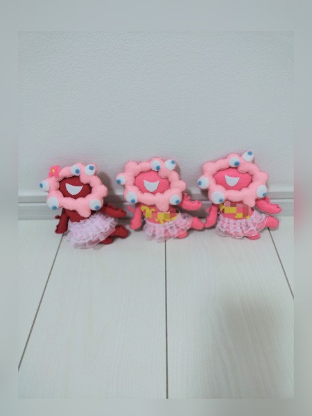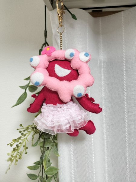 ピンクが大好きな姪っ子の子供達にピンクミャクミャクをプレゼント。レースのスカートもはかせてみました。最近のハンドメイドはミャクミャクばかりになっています。