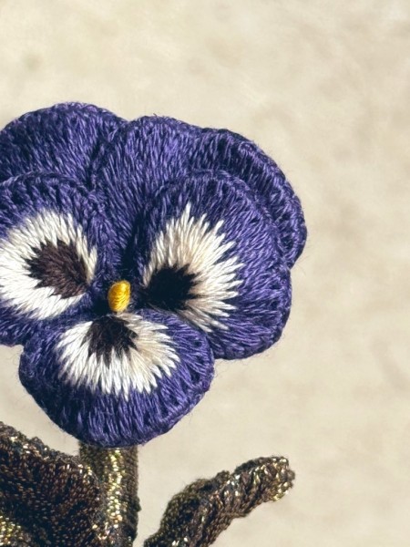 アンティークゴールドの刺繍糸を使って、大人びたパンジーに仕上げました。