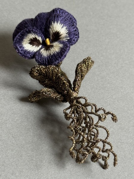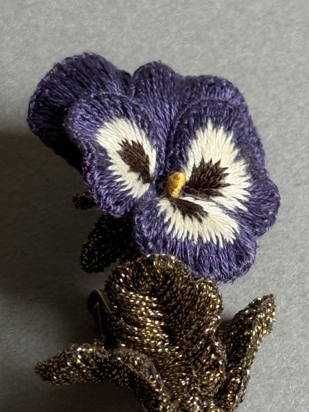 立体刺繍で作った根っこがあるパンジーのブローチです。