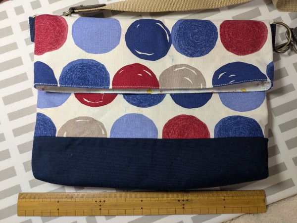 | 斜めかけのサコッシュ。作成当初、旅行の予定が迫っていたため、初心者でも簡単に作れるサコッシュレシピを探していて、kokka-fabric.comの無料レシピ『ファスナーなし!口を折るだけ、サコッシュ』にたどり着きました。レシピにはありませんが、内ポケットと、口にスナップボタンを一つ付けました。急いでいたので、テープは自作せず、市販のストラップ付を購入しました。 | |
